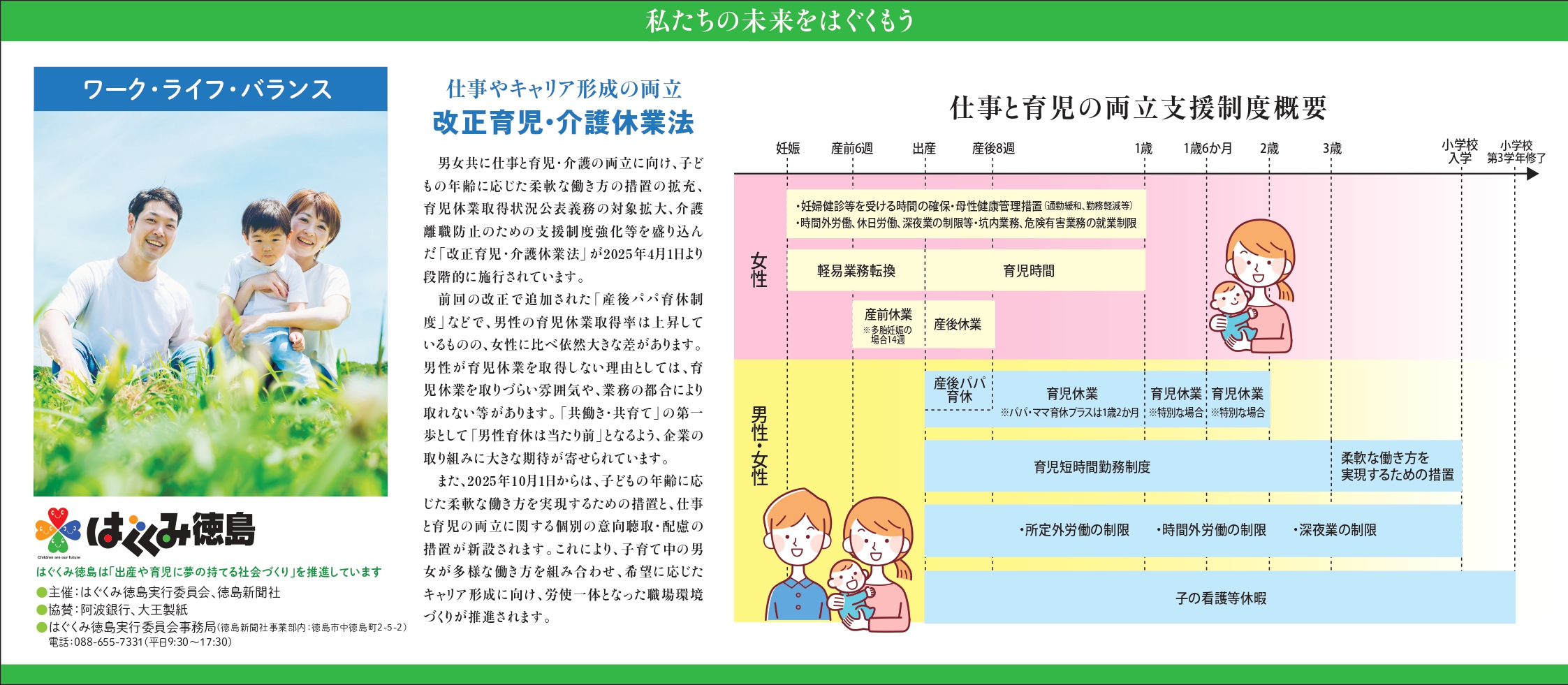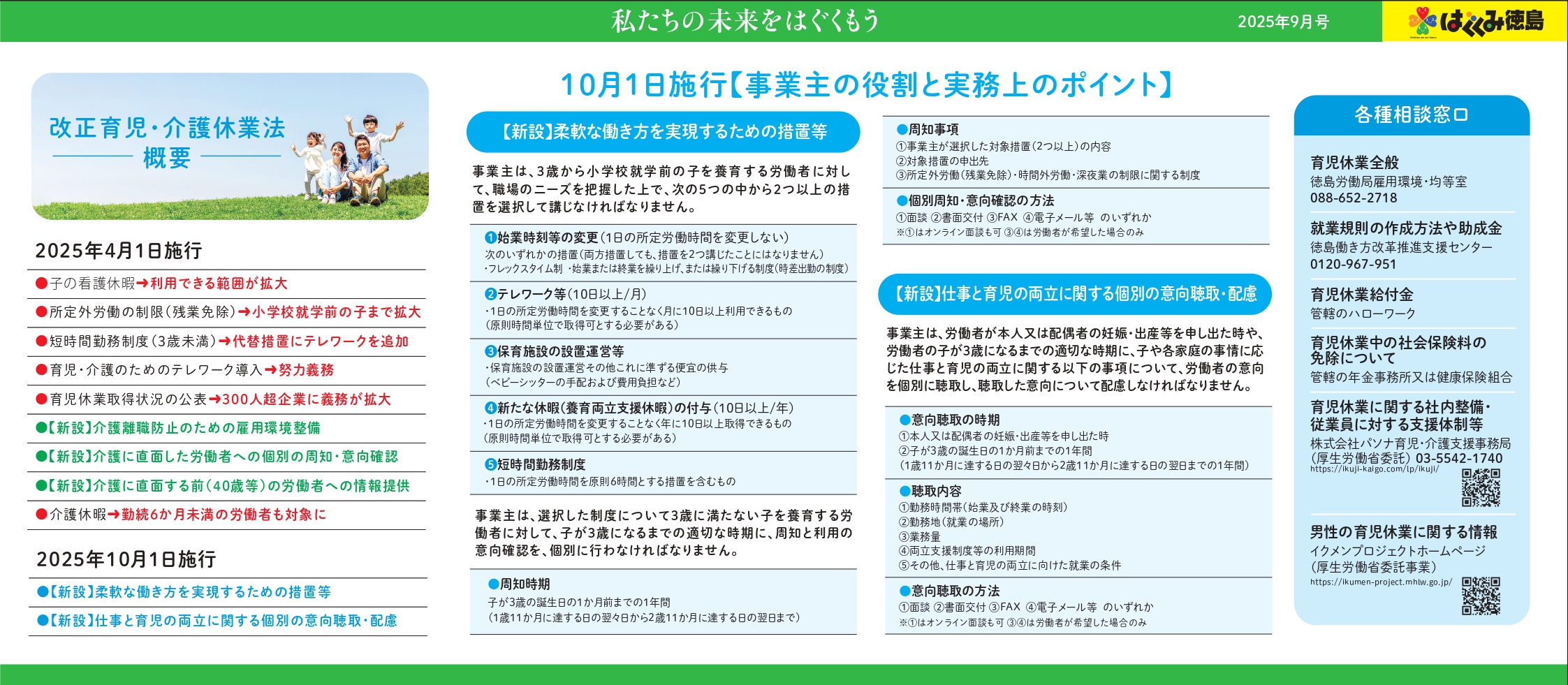 男女共に仕事と育児・介護の両立に向け、柔軟な働き方の措置の拡充、育児休業取得状況公表義務の対象拡大、介護離職防止のための支援制度強化等を盛り込んだ「改正育児・介護休業法」について。