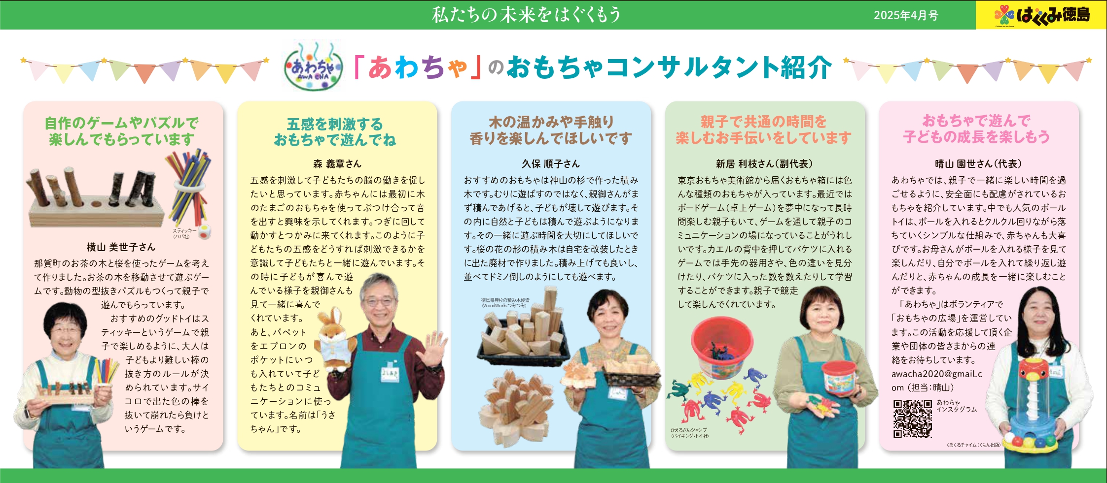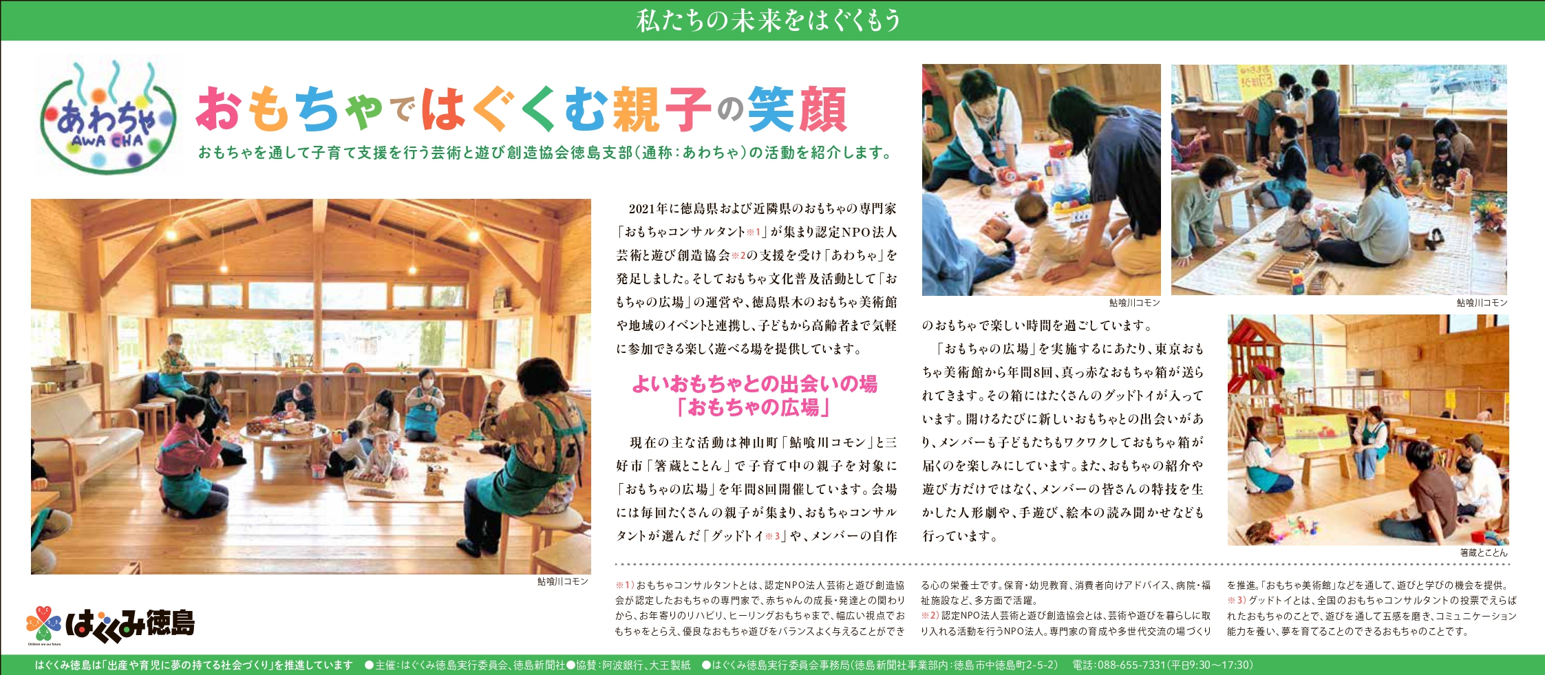 おもちゃを通して子育て支援を行う芸術と遊び創造協会徳島支部(通称:あわちゃ)の活動を紹介します。