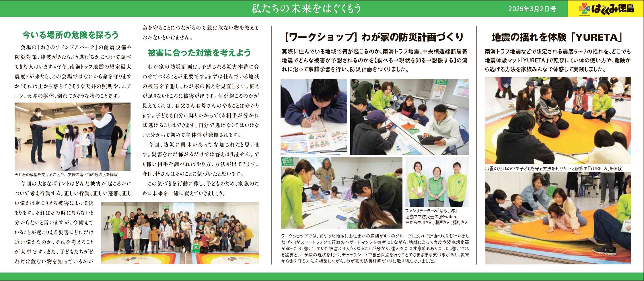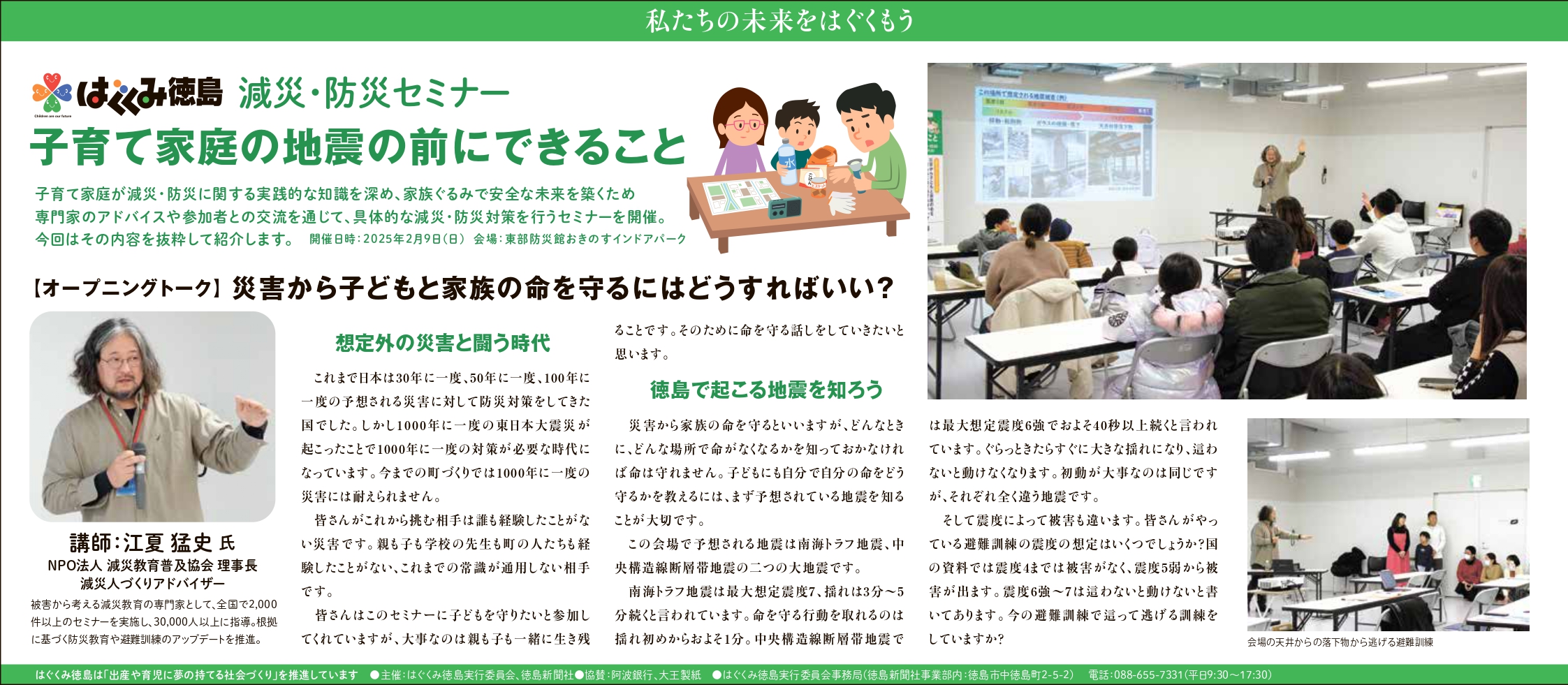 子育て家庭が減災・防災に関する実践的な知識を深め、家族ぐるみで安全な未来を築くため専門家のアドバイスや参加者との交流を通じて、具体的な減災・防災対策を行うセミナーを開催。